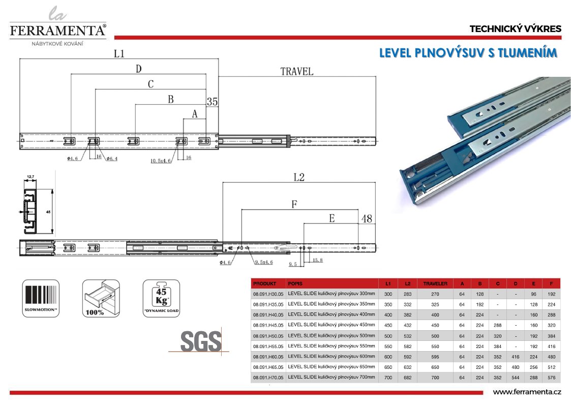 LEVEL SLIDE kuličkový plnovýsuv 700mm H45 s tlumením - 45kg